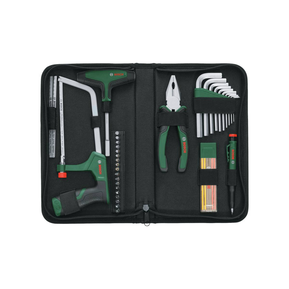 - uvnitř se skrývá pečlivě vytvořený výběr základního nářadí jako je pilka na kov, kombinované kleště, šroubovák na bity s T-rukojetí, značkovač do hlubokých otvorů, sada imbusových klíčů a šroubovací bity