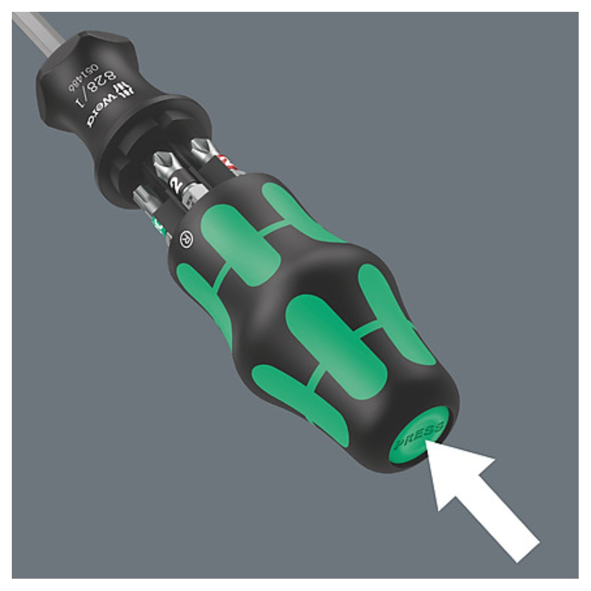 - vysouvací otočné úložiště v rukojeti s naklápěním je praktickým řešením pro snadné vyjmutí a bezpečné uložení bitů, zároveň sdružuje všechny nejpoužívanější typy šroubovacích bitů na jednom místě