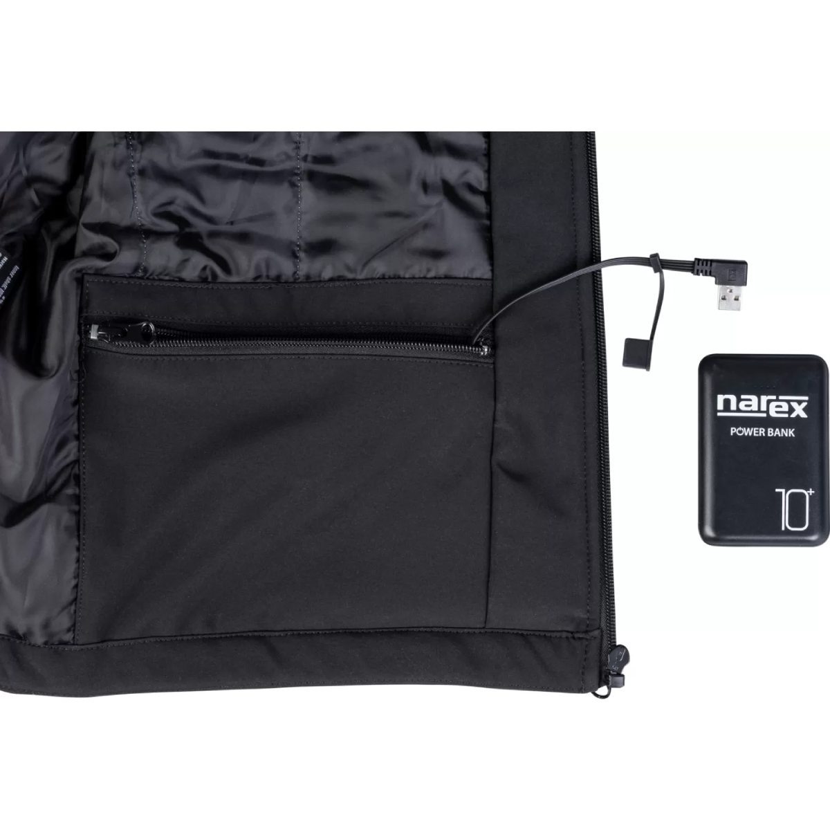 - vyhřívání je napájené z powerbanky prostřednictvím USB konektoru, umístěného ve vnitřní kapse bundy